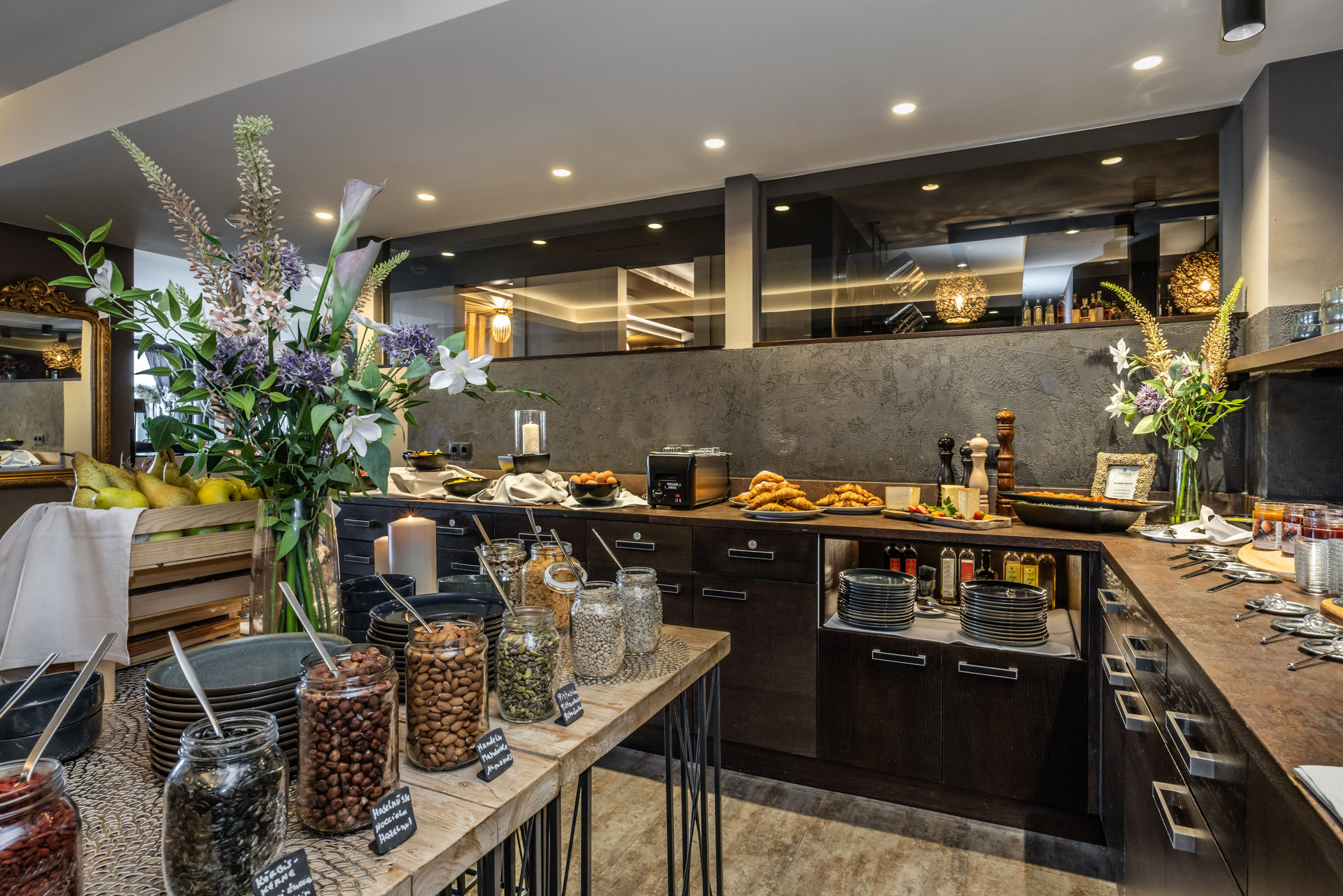 - "5-Gänge-Gourmet-Dinner mit einer Auswahl von drei Stilen: Alpin, Mediterran und Wellness. Das Menü wird von einer von unserem Sommelier empfohlenen Weinkombination begleitet, die glasweise serviert wird oder vom Buffet erhältlich ist.