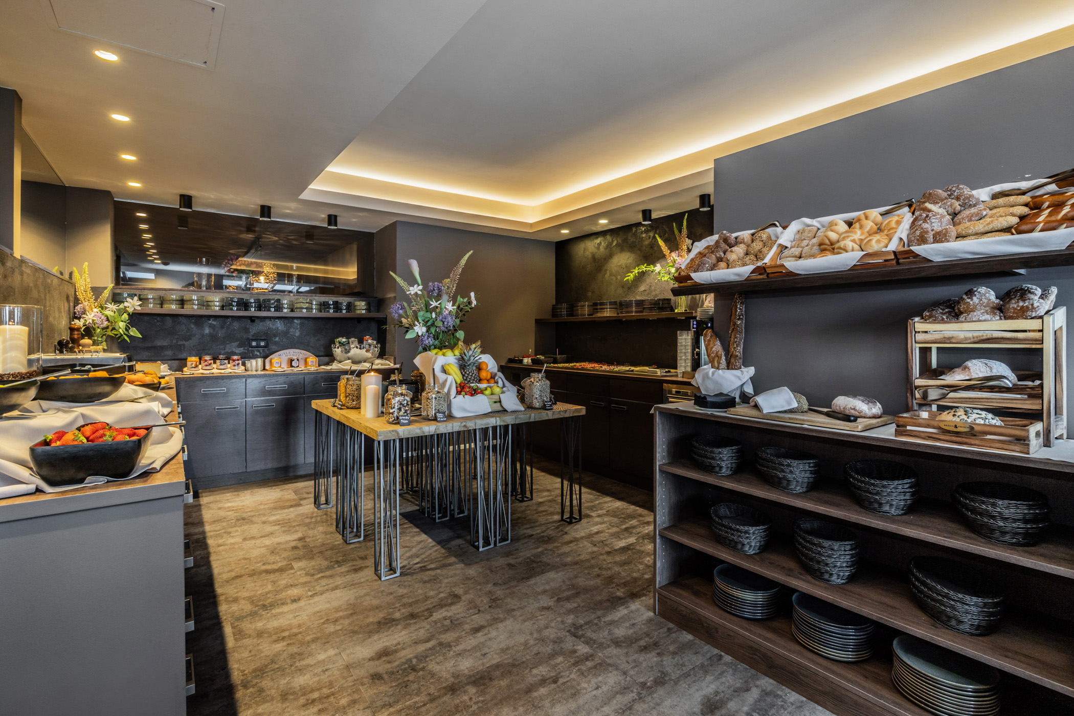 - Suppen, verschiedene Salate mit regionalem Biogemüse, regionale Wurstwaren wie der allgegenwärtige Speck, Käsebuffet und Kuchen.